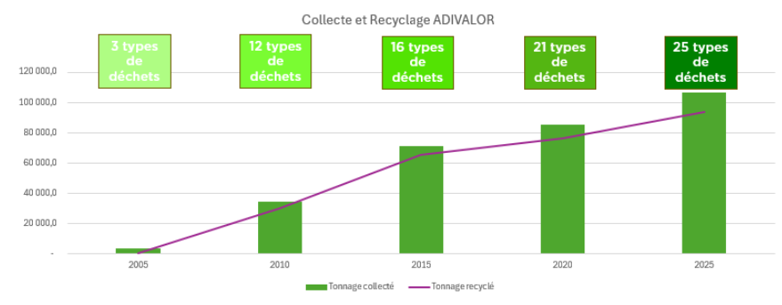 - 25 types de déchets gérés, intégrés au cours de ces 25 années d’existence. L’intégration d’autres déchets tels que les emballages des plastiques agricoles, les emballages de semences potagères et gazons, et les cartons groupeurs est planifié sur 2026.